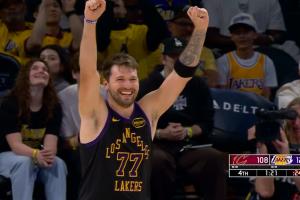 GIF-东契奇双手勉扣!詹姆斯起立致意!